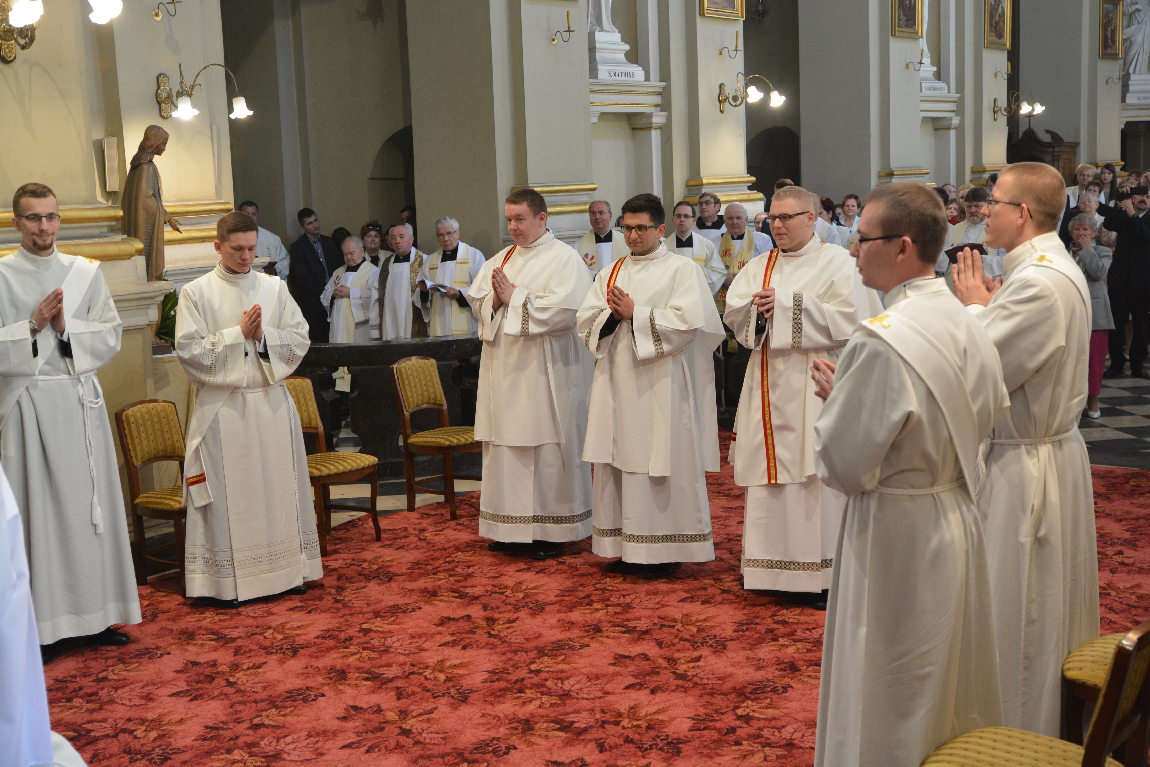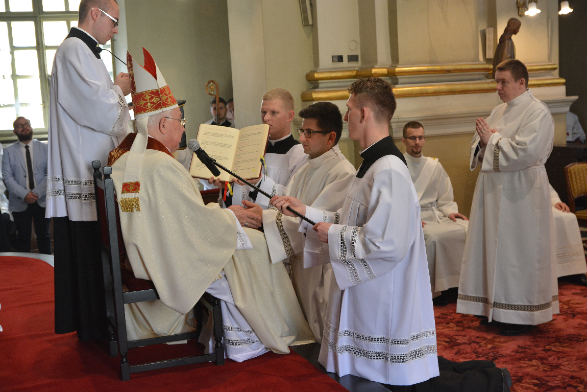 Kandydaci do święceń diakonatu i prezbiteratu publicznie wyrazili wolę przyjęcia święceń i złozyli przyrzeczenia posłuszeństwa biskupowi i przełożonym. Po Litanii do Wszystkich Świętych rozpoczęła się najważniejsza część sakramentu święceń diakonatu. Ks. bp w ciszy włożył ręce na głowę każdego kandydata ustanawiając go diakonem. Następnie odmówił modlitwę konsekracyjną w której prosił Chrystusa o moc i potrzebne łaski dla otrzymujących godność diakonatu. Po włożeniu stroju liturgicznego - stuły i dalmatyki nowi diakoni otrzymali z rąk biskupa księgę Ewangelii na znak władzy głoszenia Słowa Bożego.